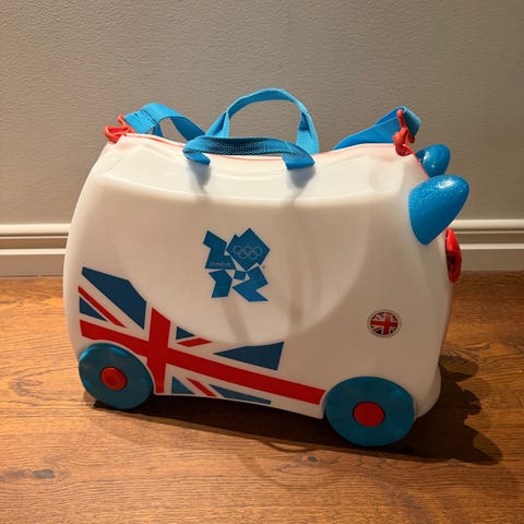 Samsonite barnväska med hjul i blått och gult. Väskan har ett lekfullt djurmotiv och är utrustad med ett utdragbart handtag för enkel transport. Insidan är klädd med ett mönstrat foder och har remmar för att hålla innehållet på plats.