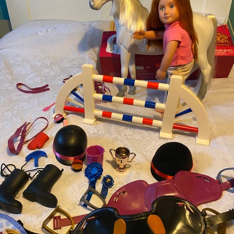 Dockan har långt blont hår och är klädd i en randig topp och röd kjol.