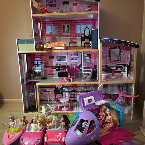 Barbie dockhus med flera våningar, inklusive rutschkana och hiss.