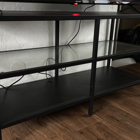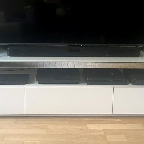 Fin tv bänk från IKEA med glashylla på andra planet.