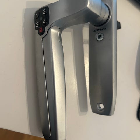 Assa dörrhandtag med uttag för låscylinder.