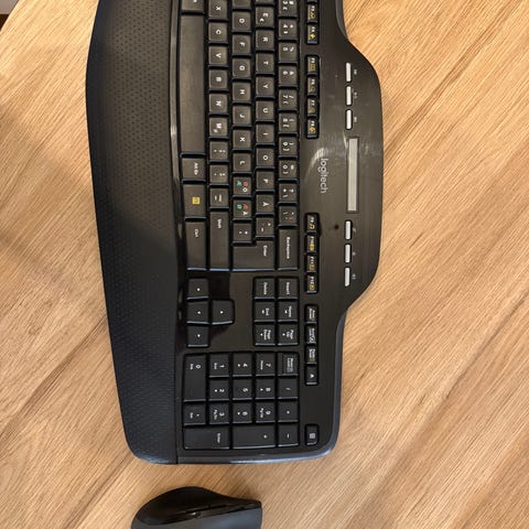 Logitech tangentbord och mus set med trådlös anslutning, svart färg. Musen drivs av batterier och har en USB-mottagare för anslutning. Tangentbordet har standardlayout och är avsedd för allmän datoranvändning.