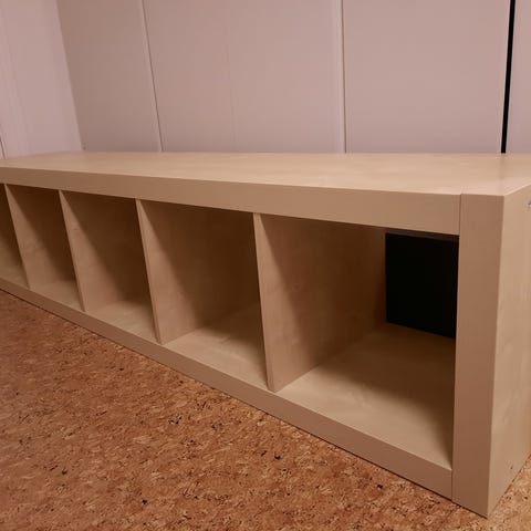 Förvaringslåda DRÖNA från IKEA i svart tyg. Anpassad för att passa i hyllan KALLAX med måtten 33x38x33 cm (bredd/djup/höjd). Den har infällda ”handtag” på framsidan och baksidan, och går att fälla ihop med en dragkedja i botten.
