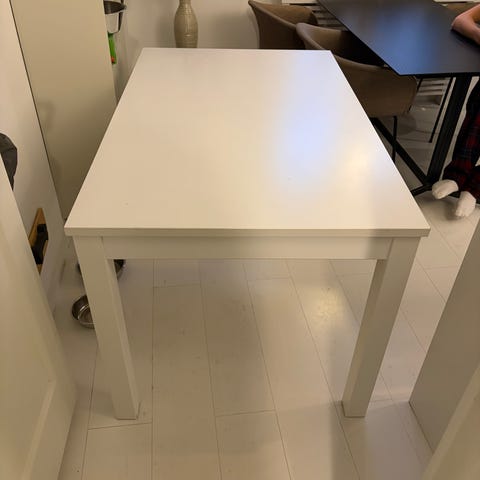IKEA matbord (bredden kan anpassas till 140,160 eller 180 cm) med 4st matchande stolar i svart färg. Bordet och stolarna är tillverkade av trä och har en enkel design som passar för matplatsen.