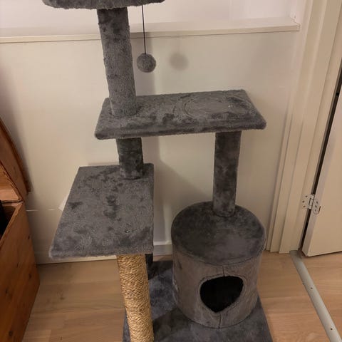 Grått klösträd för katt med flera plattformar och en liten koja. Tillverkat i material som är lämpliga för kattens klösning och lek. Passar för kattägare som vill ge sin katt en plats att klösa, vila och leka.