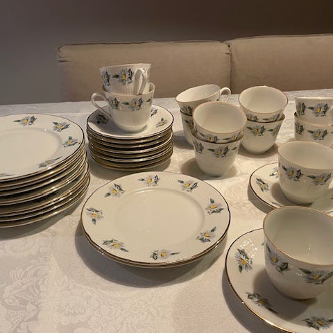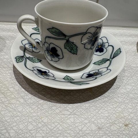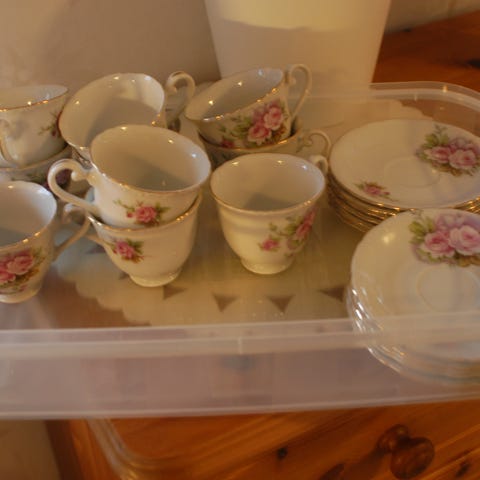 11 koppar och 12 fat, med blomsterdekorationer. Ett fynd!