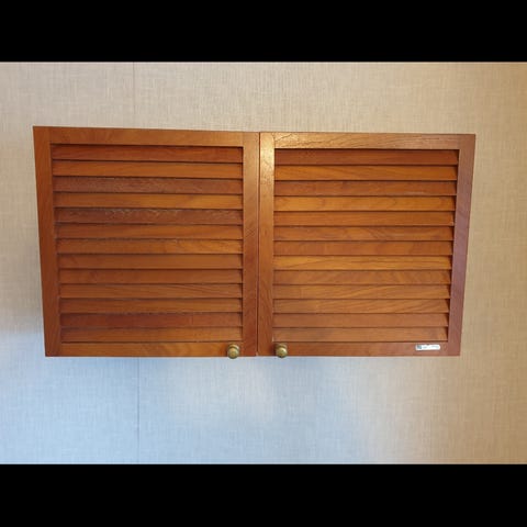 Retro Badrumsinredning från 1977 i teak och detaljerna är i mässing. Det finns bruksslitage men i stort