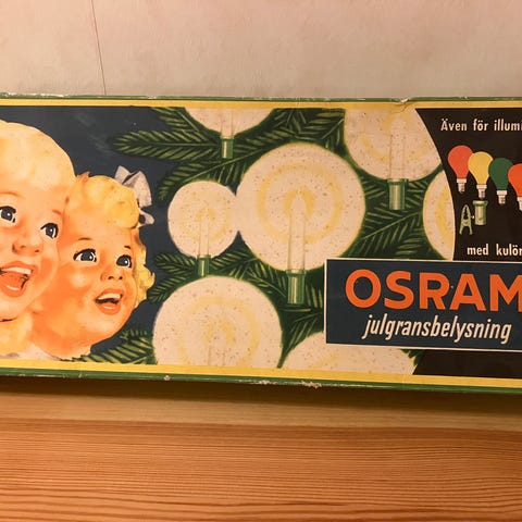 Vacker och sällsynt OSRAM julgransbelysning från sent 1950-tal / tidigt 1960-tal. Ljusslingan är lite använd och levereras i originalkartong med klassisk tidstypisk design. Ljusen är i glas, inte plast – ger ett varmt och autentiskt sken. Perfekt för samlare eller som nostalgisk juldekoration i hemmet.