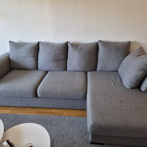 Soffan är lite nersjunken på ena långsidan jämte armstödet.