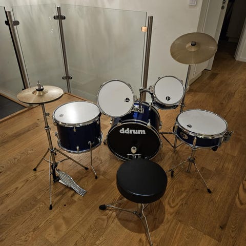 Trumset med bastrumma, två häng pukor, golvpuka, virveltrumma, cymbal, highhat och justerbar trumstol.