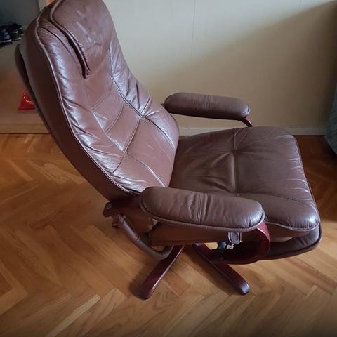 IKEA Skinnfåtölj i brunt läder med fotstöd