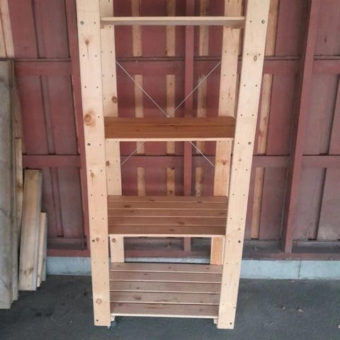 Hylla i trä, 70-tal, i gott skick. Två delar som lätt kan tas isär, bäras och sättas ihop. Har även en fungerande ojordad armatur.
