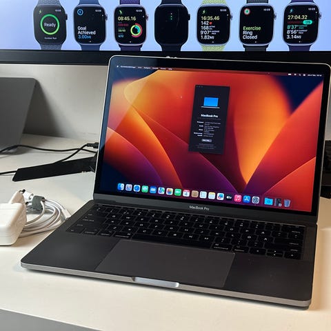 Apple MacBook Pro Laptop med macOS Catalina. Utrustad med en 2,3 GHz Quad-Core Intel Core i5-processor, 8 GB RAM och 512 GB SSD-lagring. Har en skärm med bakgrundsbelysning och en numerisk tangentbordslayout.