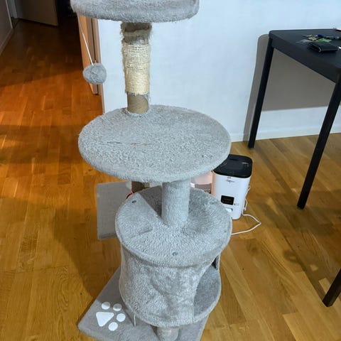 Klösträd för katt med flera plattformar och en hängande boll som leksak.