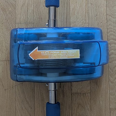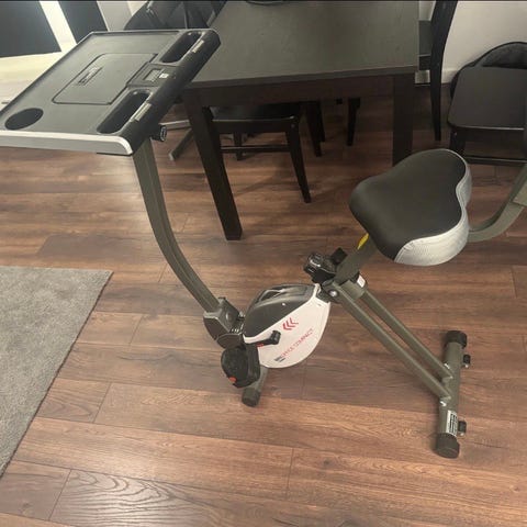 Trekrunner motionscykel med justerbart säte, handtag och inbyggd display för att visa träningsdata. Cykeln har en orange och svart design och är lämplig för hemmaträning.