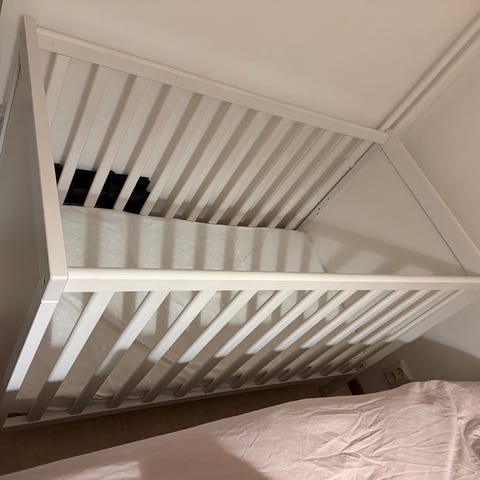 Spjälsängen har aldrig sovits i (förutom av ett gäng gosedjur).
