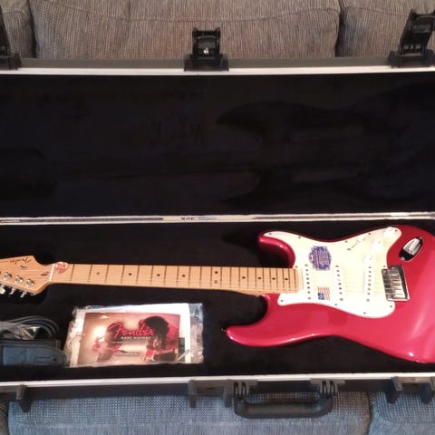 Fender Stratocaster elgitarr i candy apple röd.nya stämskruvar kluson deluxe. Ny switch nya vol och tonpotar.originalmickar.80proc kvar bandstavar.c typ hals.mycket fin gitarr.hardcase ingår köpt på gear4music.