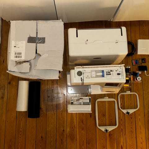 Melco Amaya brodyrmaskin med tillbehör inklusive flera brodyrbågar i olika storlekar, trådrullar i varierande färger och andra komponenter för brodyrarbete. Maskinen och tillbehören är lämpliga för användning inom textilbrodyr.