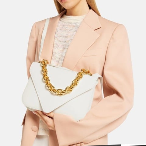 Den ikoniska V-för-Veneta-formen är tydligt integrerad i denna Bottega Mount-axelväska. Tillverkad i Italien och designad med två bäralternativ: en överdimensionerad guldfärgad kedja samt en axelrem i läder, vilket gör att du enkelt kan variera hur du bär väskan.