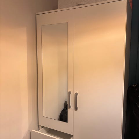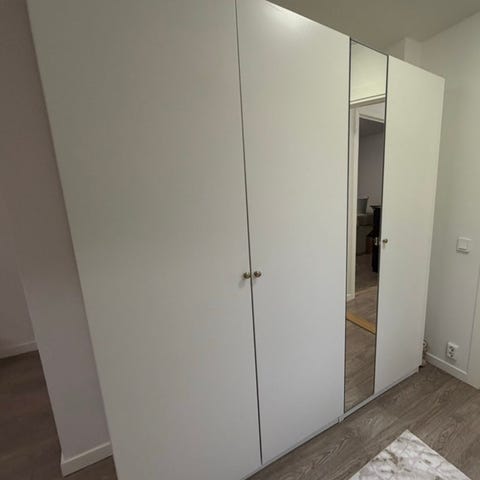 Säljer en garderob från JYSK, modell VEDDE (ca 220 x 197 cm). Vit garderob med spegeldörrar som ger både bra förvaring och ett modernt utseende. Speglarna gör rummet ljusare och större.