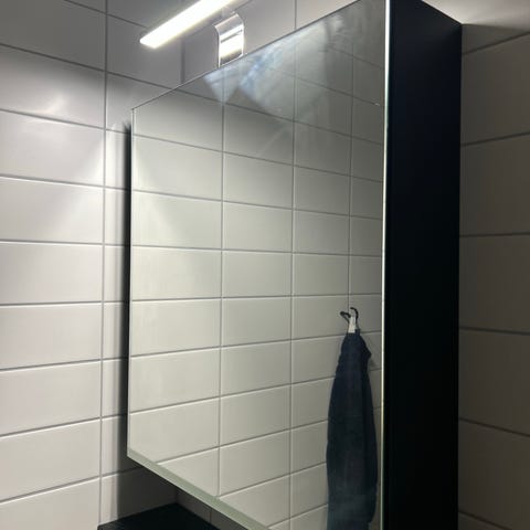 Aspen spegel med integrerad belysning. Spegeln är utformad för att monteras på vägg och har en modern design med en ljuskälla ovanför spegelglaset. Passar för badrum eller andra utrymmen där extra ljus behövs vid spegeln.