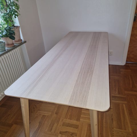 Matbord ”Kopparbo” i svart trä. Har en del slitage på ytan och på sidor då färg avskavt. Inget jag stör mig men kan slipas och betsas om. Köpt för 7000 för ca 1 år sedan. I övrigt inga skador på ben eller underrede.