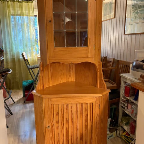 Hörnvitrinskåp i furu med glasdörrar – lantlig/country stil från 1980-90-talet. Praktiskt och charmigt hörnskåp i massiv furu med varm, gyllene ton och synliga kvistar som ger genuin lantlig känsla. Perfekt för att utnyttja hörn i kök, matsal eller vardagsrum – tar lite golvyta men ger mycket förvaring och visningsutrymme.