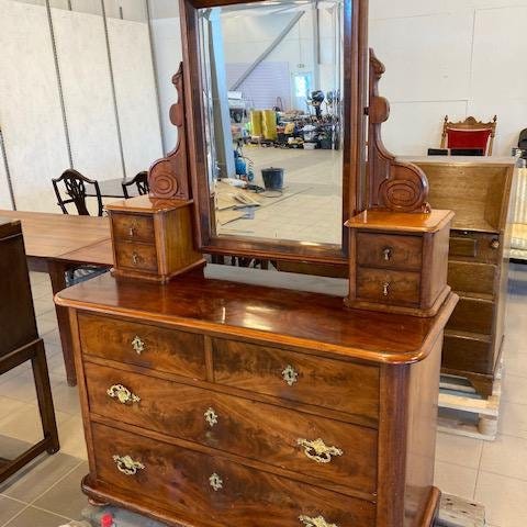 Antik spegelbyrå med en stor träram och två tillhörande skåp. Spegeln har detaljerad utsmyckning i trä, inklusive snidade element och dekorativa beslag. Skåpen har flera lådor med handtag och matchar spegelns design. Produkten är tillverkad i trä och har en klassisk, dekorativ stil.