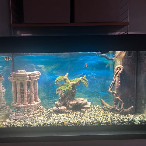 Ingår beysning, doppvärmare, grus, dekor, stenar, automatiskt matare. På köpet ger jag olika akvarieväxter gratis. Jag har en del fiskar som kan säljas, vissa också kan skänkas.