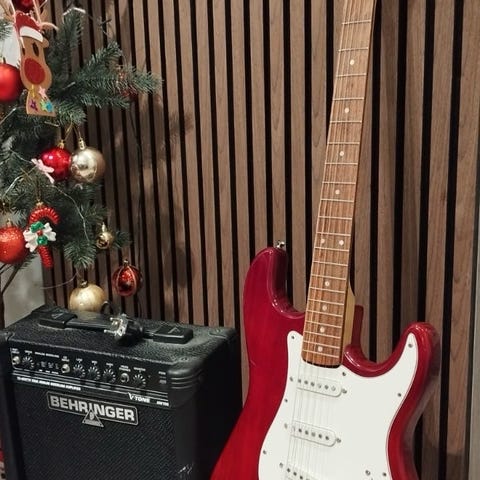 En rosa mini 3-strängad elgitarr, ungefär samma storlek som en ukulele, med inbyggd förstärkare och högtalare. Kommer med kort för att lära sig ackord och gratis videolektioner.