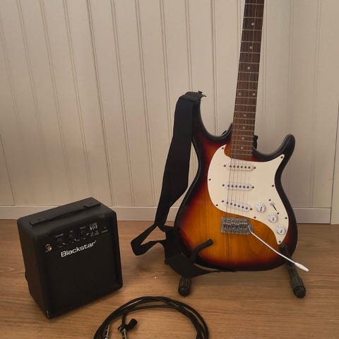 Nybörjar elgitarr, 3/4-storlek. Nyligen bytta strängar. Saknar 6.3 mm kabel (går att köpa på amazon, Clas Ohlson eller musikaffär tex). Men både gitarr och förstärkare fungerar. Perfekt julklapp!