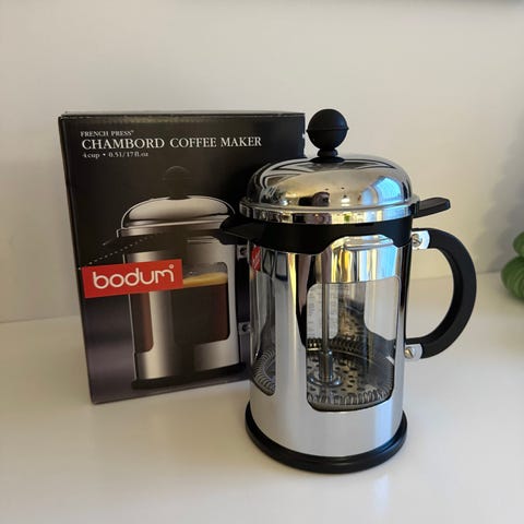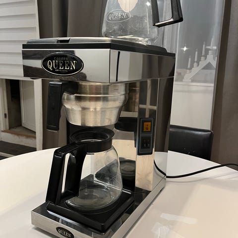 Voltage Kaffeautomat i rostfritt stål med svart handtag och lock. Designad för att brygga kaffe och förvaras på värmeplatta.