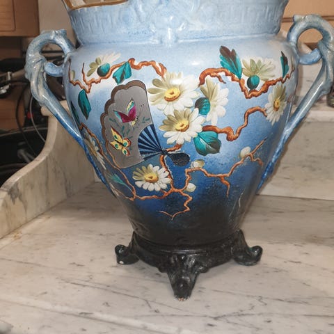 Handmålat blommotiv i klassiskt koboltblått med elegant guldkant.