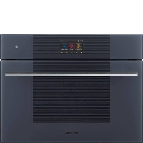 Smeg Ånga ugn i svart färg med gulddetaljer. Ugnstyp: Ånga. Utrustad med flera tillbehör inklusive plåtar och ett galler. Designad för ångkokning och bakning med flera funktioner.