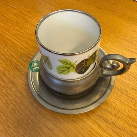 Rein Zinn är tenn från Tyskland, kaffekoppar i porslin Bavaria