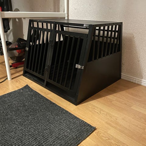 Hundbur, dubbel, med möjlighet att ta bort mellanväggen. Har använts för jämthundar.