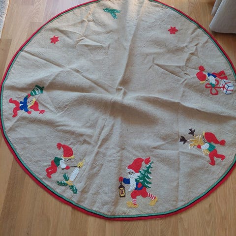 Vacker vintage handbroderad Julgransmatta handbroderad vintage. En fläck annars väldigt fint skick. Finns i centrala Malmö, skickas ej.