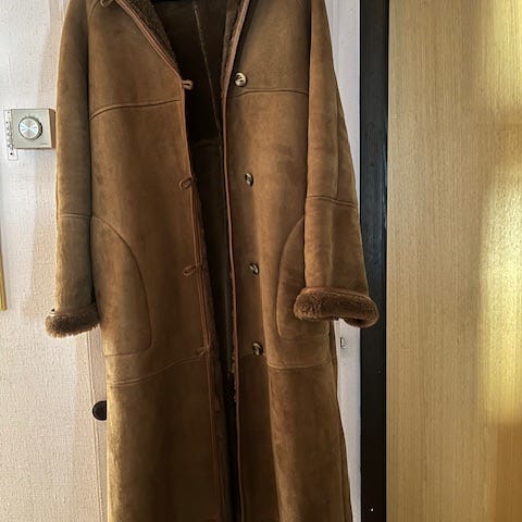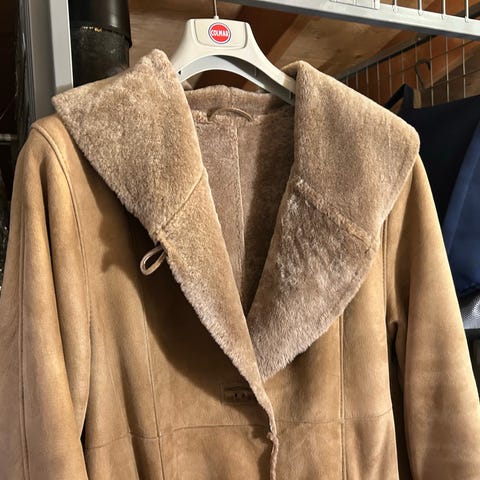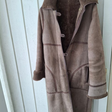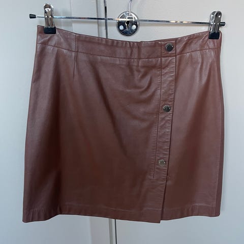 Konjaksfärgad mockakjol (lamm) sydd av skinnskräddare. Två fickor i sidosöm. Midja 70 cm, längd 94 cm