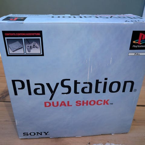 Sony PlayStation spelkonsol inklusive kartong, handkontroll, AV-kablar och spel.