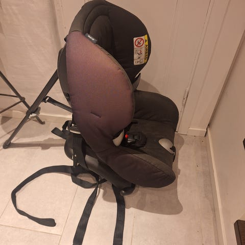 Stabil bilbarnstol (bakåtvänd) som fästes med band. Tyget är lite missfärgat pga av sol och användning men i övrigt fullt fungerande.