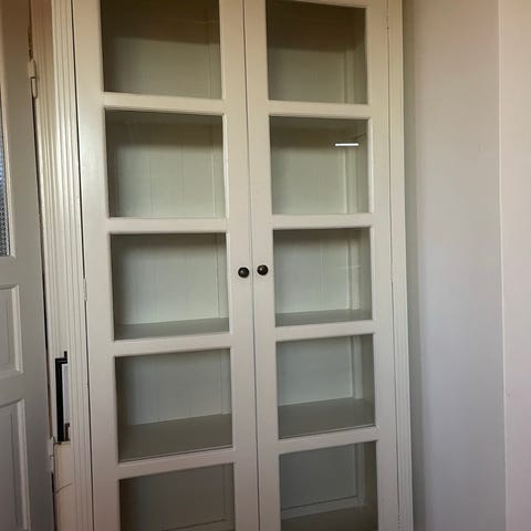 Stort skåp i valnötsträ med rotinlägg och blyinfattat glas i fint skick.