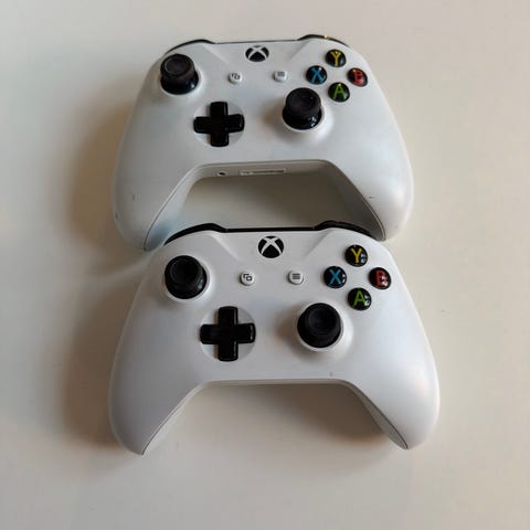Microsoft Xbox trådlös handkontroll i svart färg. Har lite överkänslig vänster-joystick (kan ibland registrera en kort rörelse nedåt eller uppåt som om joysticken är konstant förd uppåt eller nedåt, vilket är störigt men kan pareras genom att föra joysticken i motsatt riktning)