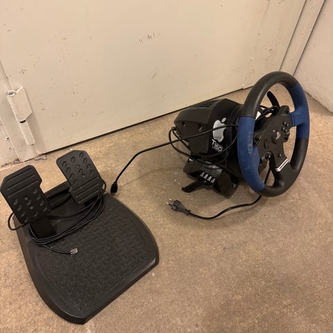 PlayStation Gran Turismo ratt och pedalset med ratt och dubbla pedaler. Ratten har PlayStation-logotyp och är svart med röda detaljer. Pedalsetet är svart och inkluderar både gas och broms. Ansluts via bluetooth