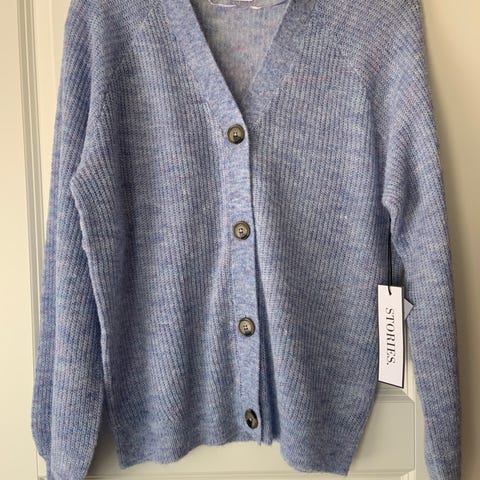 En collegeinspirerad kofta som är grå med vita ärmar, har ribbade muddar och krage med ränder, samt tryckknappar framtill. På bröstet finns ett stort H-tryck. Två fickor på framsidan.