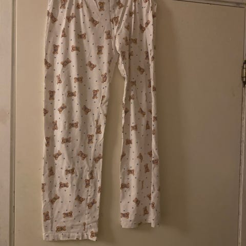 Leopardmönstrade pyjamasbyxor som är vita med svarta och gråa leopardfläckar och har elastisk midja.