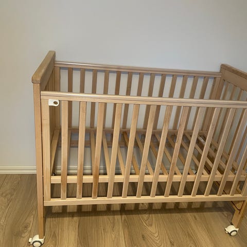 Selling a baby bed that can fully open on one side so it can be placed next to an adult bed as a bedside crib. When the baby gets older, the side can be closed again and it works as a normal crib.