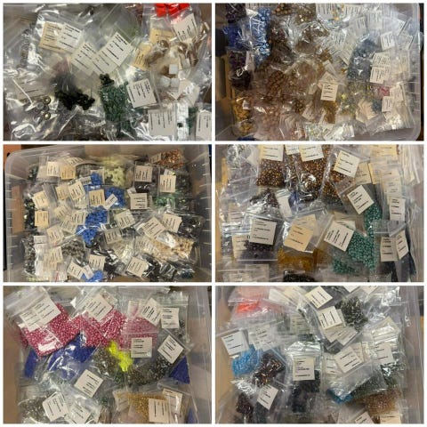 Färgglada glaspärlor i ett urval av färger och storlekar, för användning i hantverk och pysselprojekt. 17 påsar säljer alla för 2500 annars 150 kr per påse väger ungefär 1 kg var