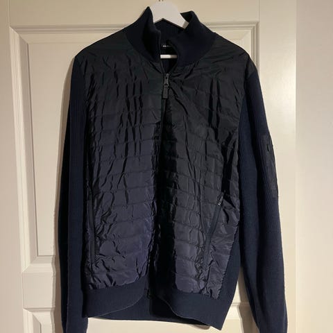Vit jacka med dragkedja från USA JL. Jackan har en röd USA-logga på bröstet och en amerikansk flagga på baksidan av nacken. Den har mörkblå detaljer på sidorna.