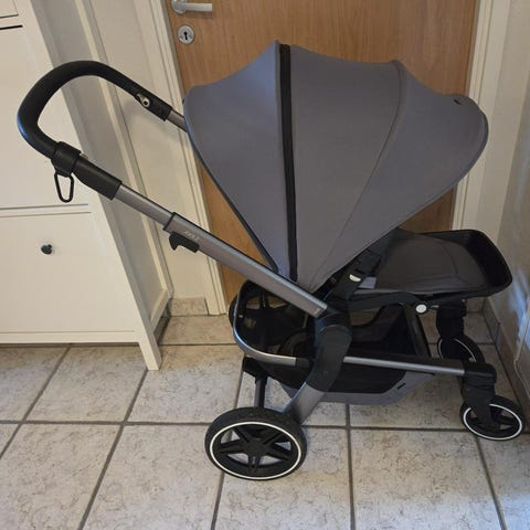 Snygg Joolz barnvagn med olika tillbehör inklusive liggdel, sittdel och bilbarnstol i bra skick. Barnvagnen har en ram med justerbart handtag och fyra hjul. Material och färg är inte specificerade. Passar för barn och erbjuder flera funktioner för olika användningsområden.