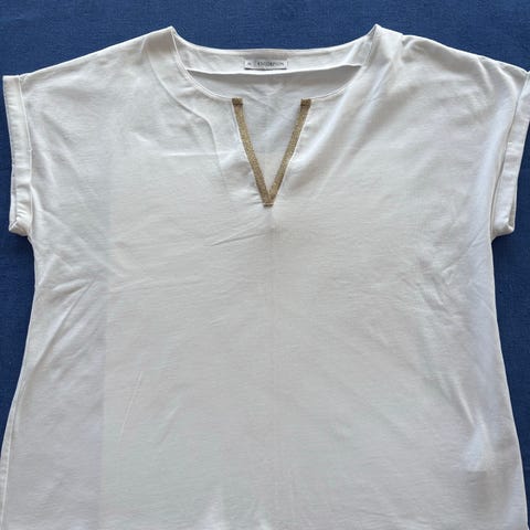 Soyaconcept topp i storlek XL för kvinnor. Brun och rosa mönstrad topp med v-ringning och korta ärmar.